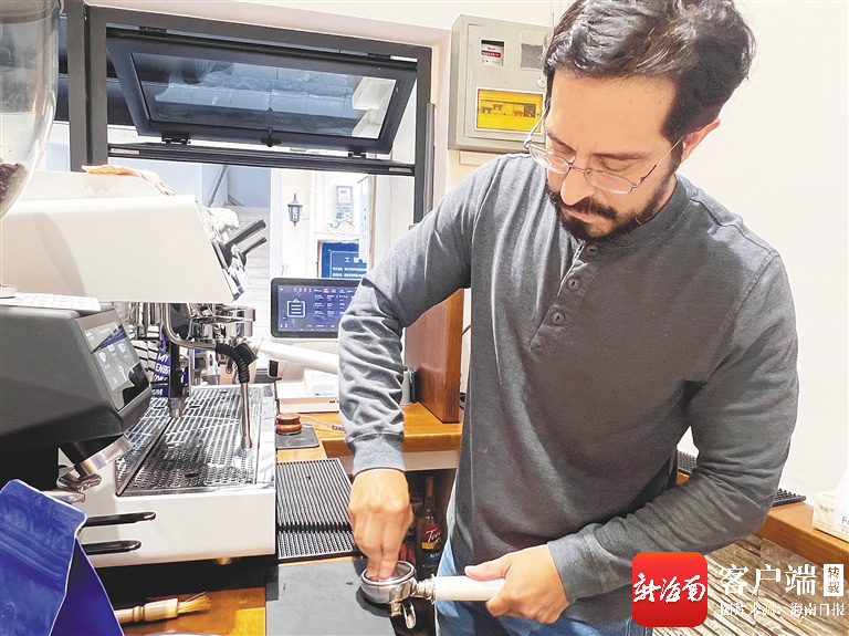 但以理在店里制作咖啡。郭萃 摄