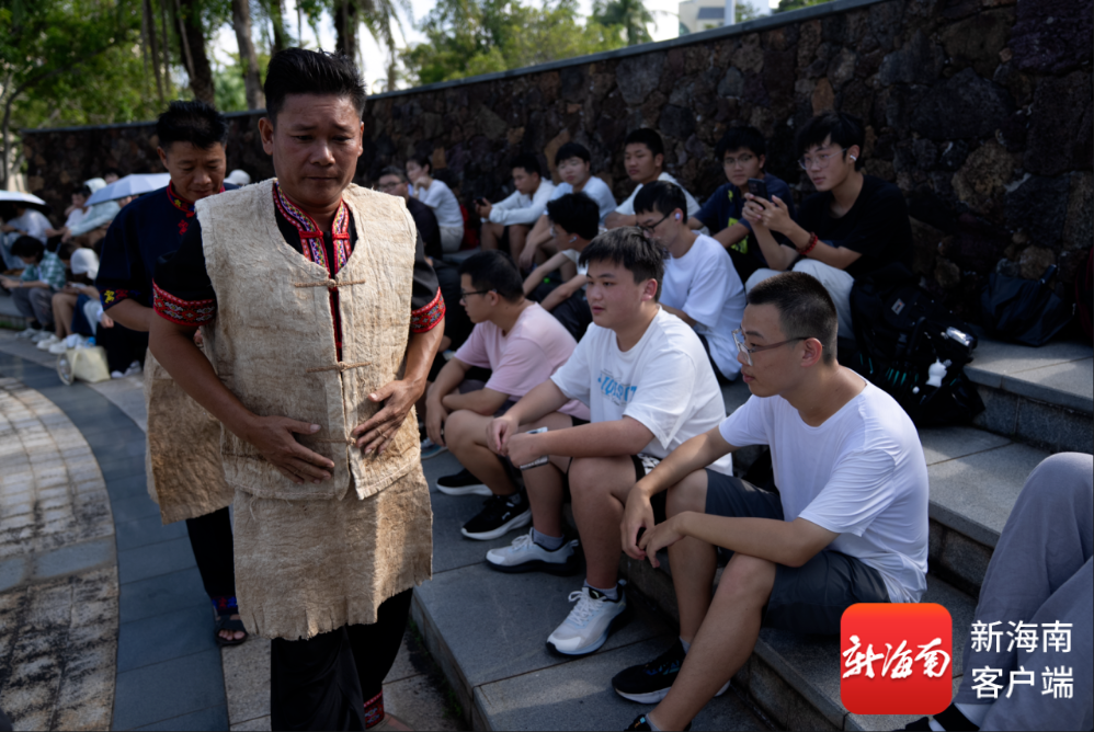 “黎族钻木取火技艺”代表性传承人身着黎族树皮衣现身海大。海南大学供图